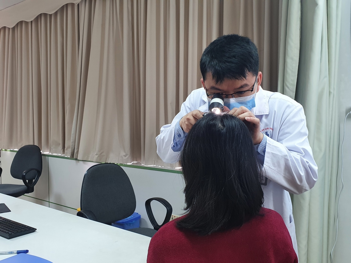 BS Quang Minh kiểm tra nang tóc cho bệnh nhân. Ảnh: BSCC