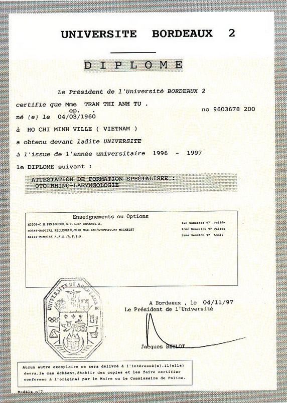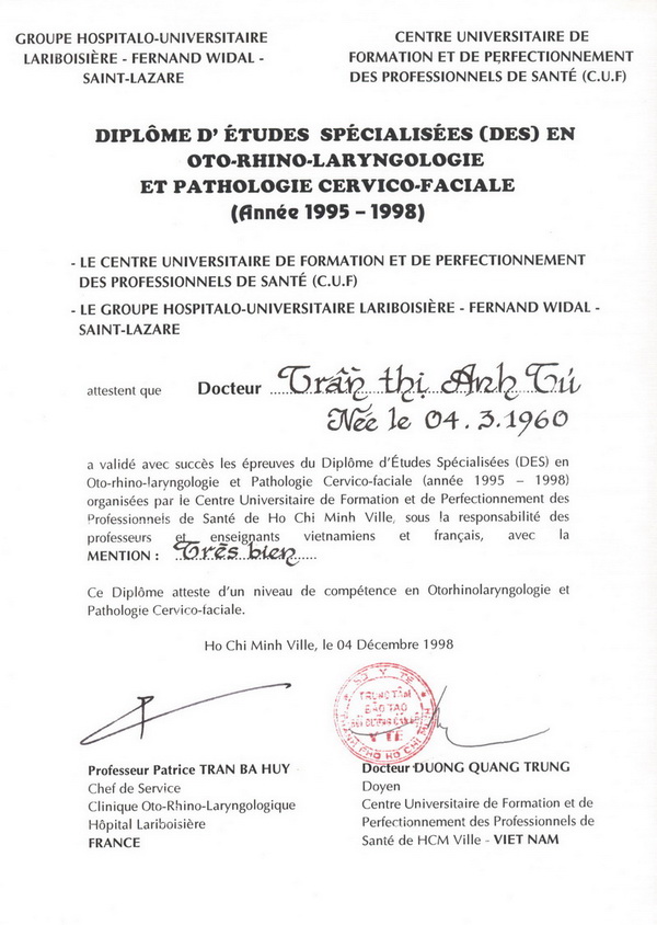 • Tốt nghiệp văn bằng chuyên khoa “DES” Pháp-Việt (khóa 1995 – 1998).