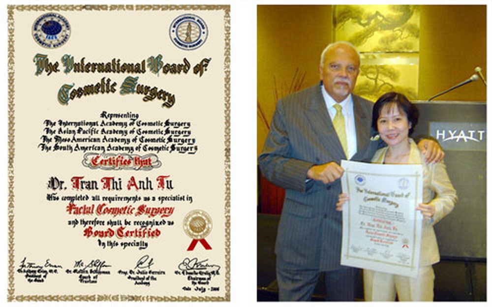 • Bằng Chứng nhận Quốc tế Trình độ Phẫu thuật Thẩm mỹ “BOARD CERTIFIED” của Hội đồng Phẫu thuật Thẩm mỹ Quốc tế (International Board of Cosmetic Surgery - IBCS).