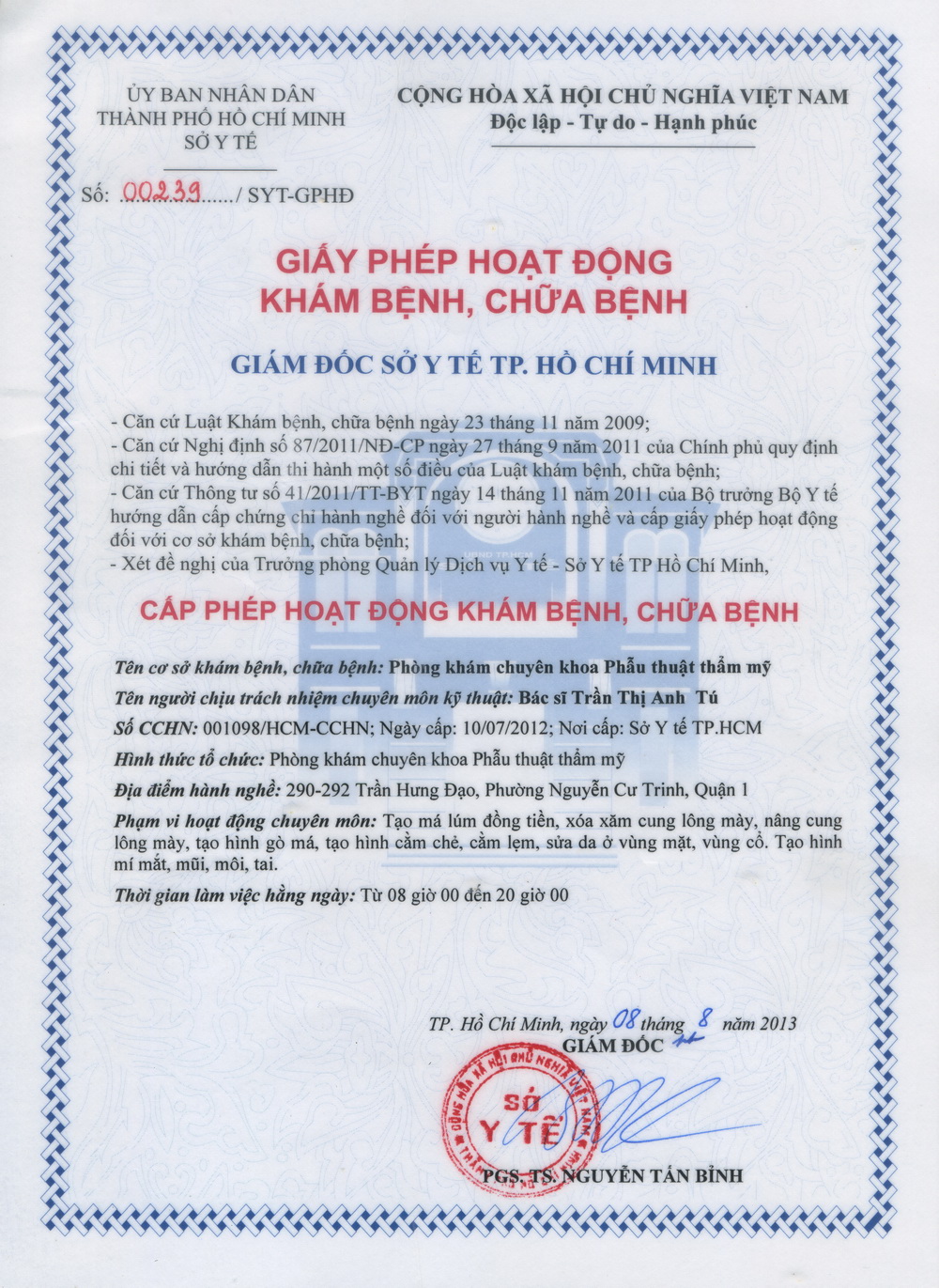 Thẩm Mỹ Viện Bác Sĩ Tú do Tiến sĩ Bác sĩ Trần Thị Anh Tú trực tiếp phụ trách, hoạt động theo Chứng chỉ Hành nghề số 001098/HCM-CCHN, và Giấy phép Hoạt động số 00239/SYT-GPHĐ do Sở Y tế TP Hồ Chí Minh cấp