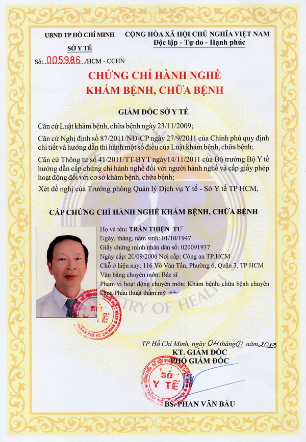 Chứng chỉ hành nghề khám bệnh chữa bệnh của Bác Sĩ Trần Thiện Tư